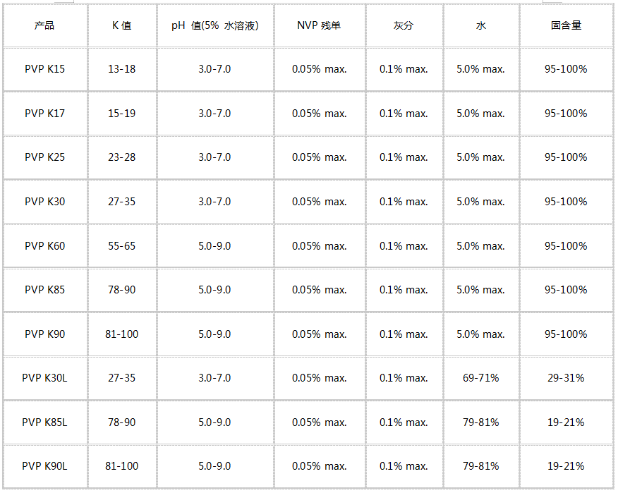 產品特性:工業級PVP以粉末和水溶液形式存在,易溶于水、醇及其他有機溶劑。極易吸潮,具有優良的成模性,粘性、化學穩定性,無毒等特性。